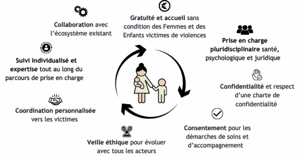 Au regard des constats accablants, nous avons axé notre activité sur l’accompagnement et le soutien des Femmes et/ou Enfants victimes ou témoins de diverses formes de violence, qu’elles se produisent en famille, dans la rue, au travail, à l’école, dans le sport, dans la culture, en ligne, ou ailleurs.Nous avons souhaité établir une couverture territoriale entre les différentes structures existantes.